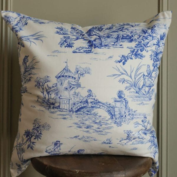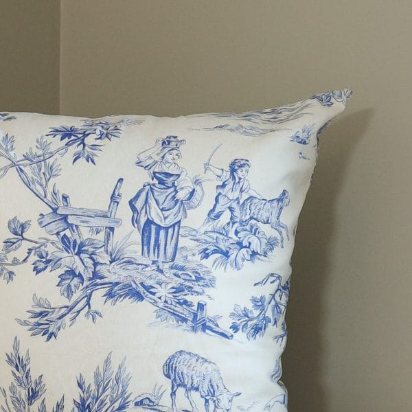 This 20 x 20 designer toss pillow cover is a 100% cotton, romantic delft toile pattern suitable for any space.