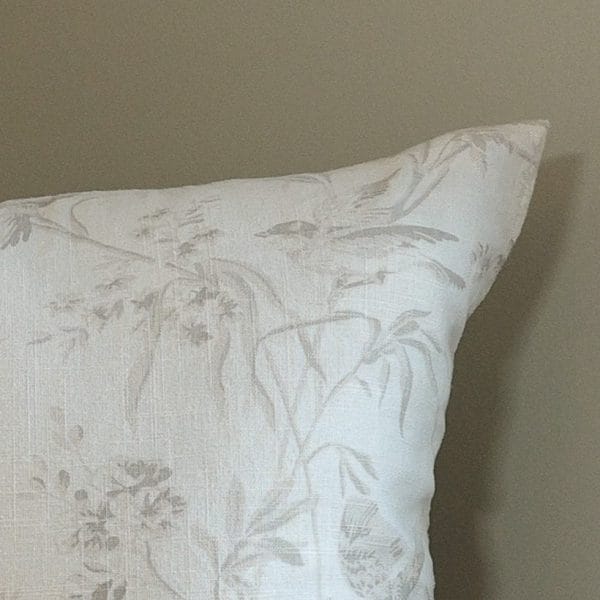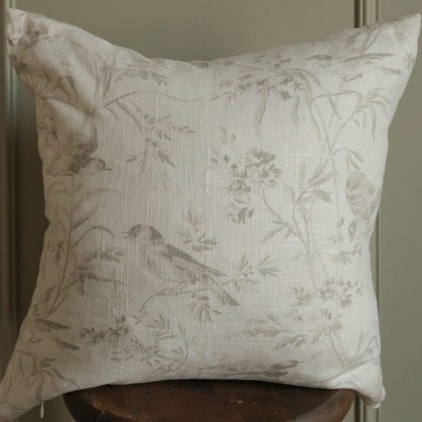 This 20 x 20 designer toss pillow cover is a 55% linen, 45% rayon, soft, romantic bird toile pattern suitable for any space.