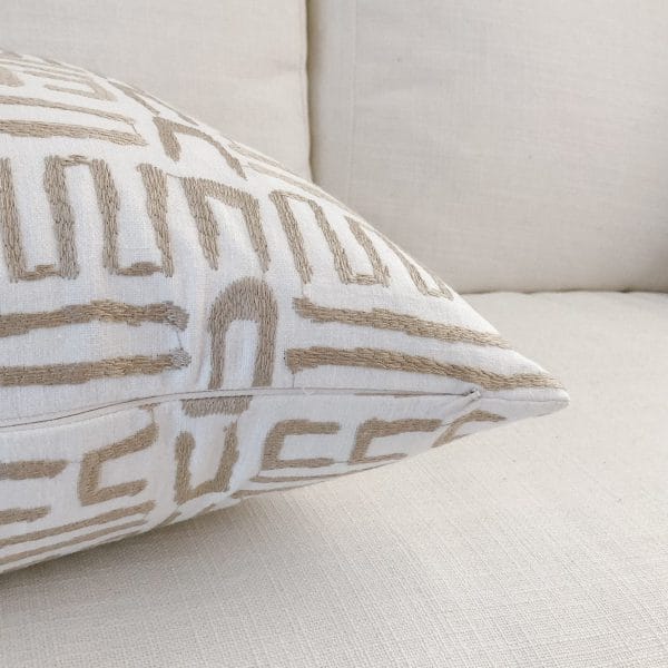 A 20” x 20” designer toss pillow with a mudcloth vibe! This stunner has a white linen-look basecloth with taupe embroidery in a simple pattern, and looks amazing paired with “Terre” or “Strikethrough”.