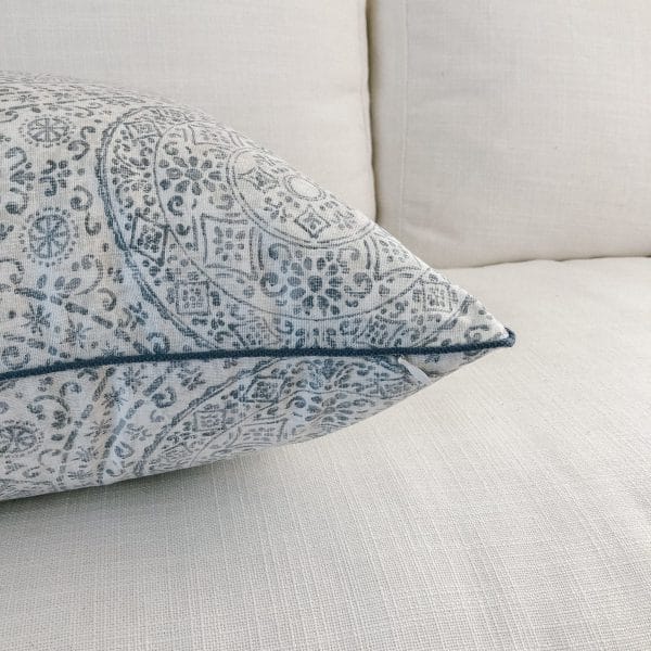 This 20” x 20” designer toss pillow is a soft blue-grey mixed with a warm white, and the large scale circular Suzani-like pattern will make a statement on your sofa or bed. The delicate navy cording in the seam adds a custom touch, and allows this pillow to be easily paired with our “Morrow” or “Lounge” toss cushions!